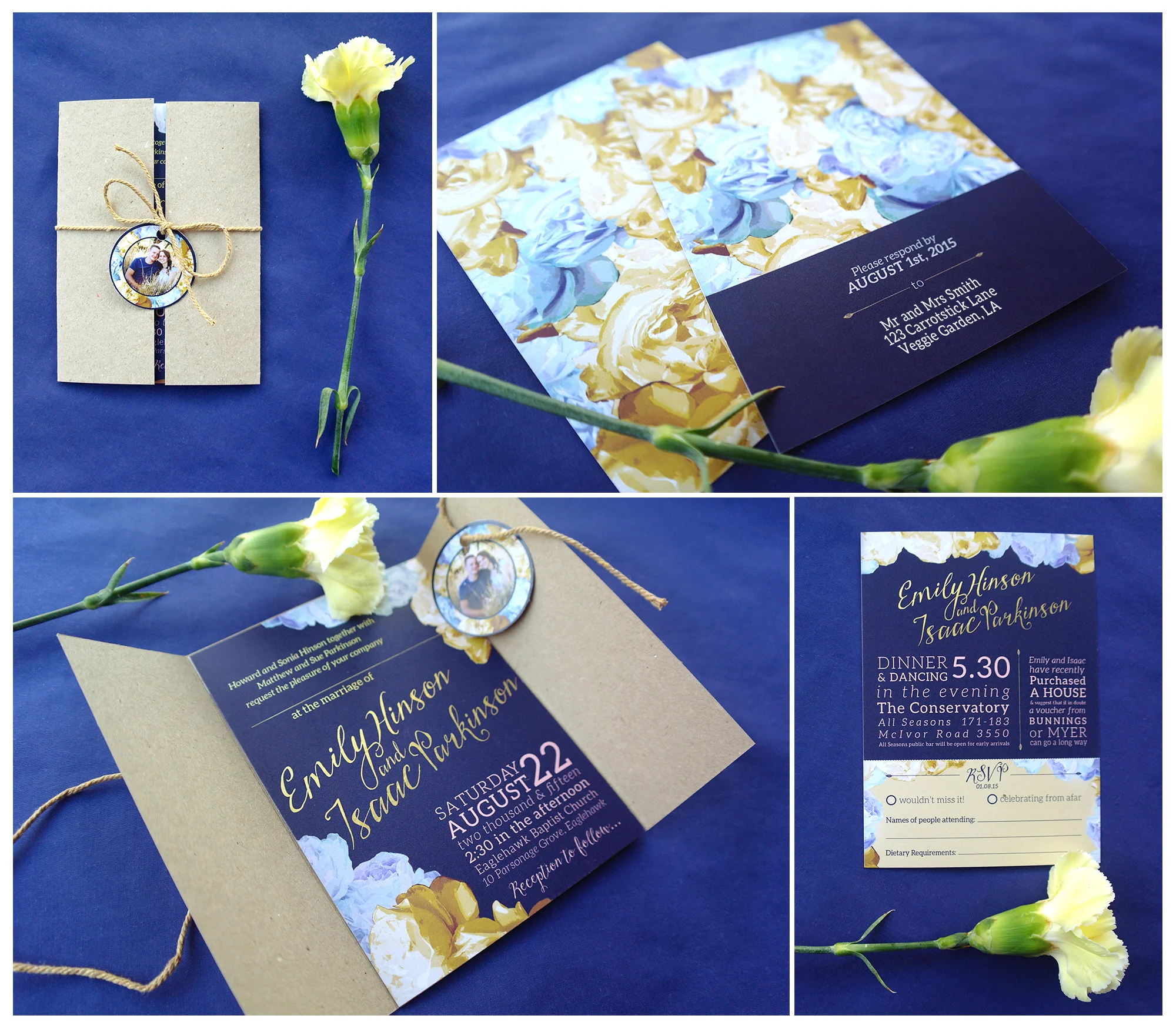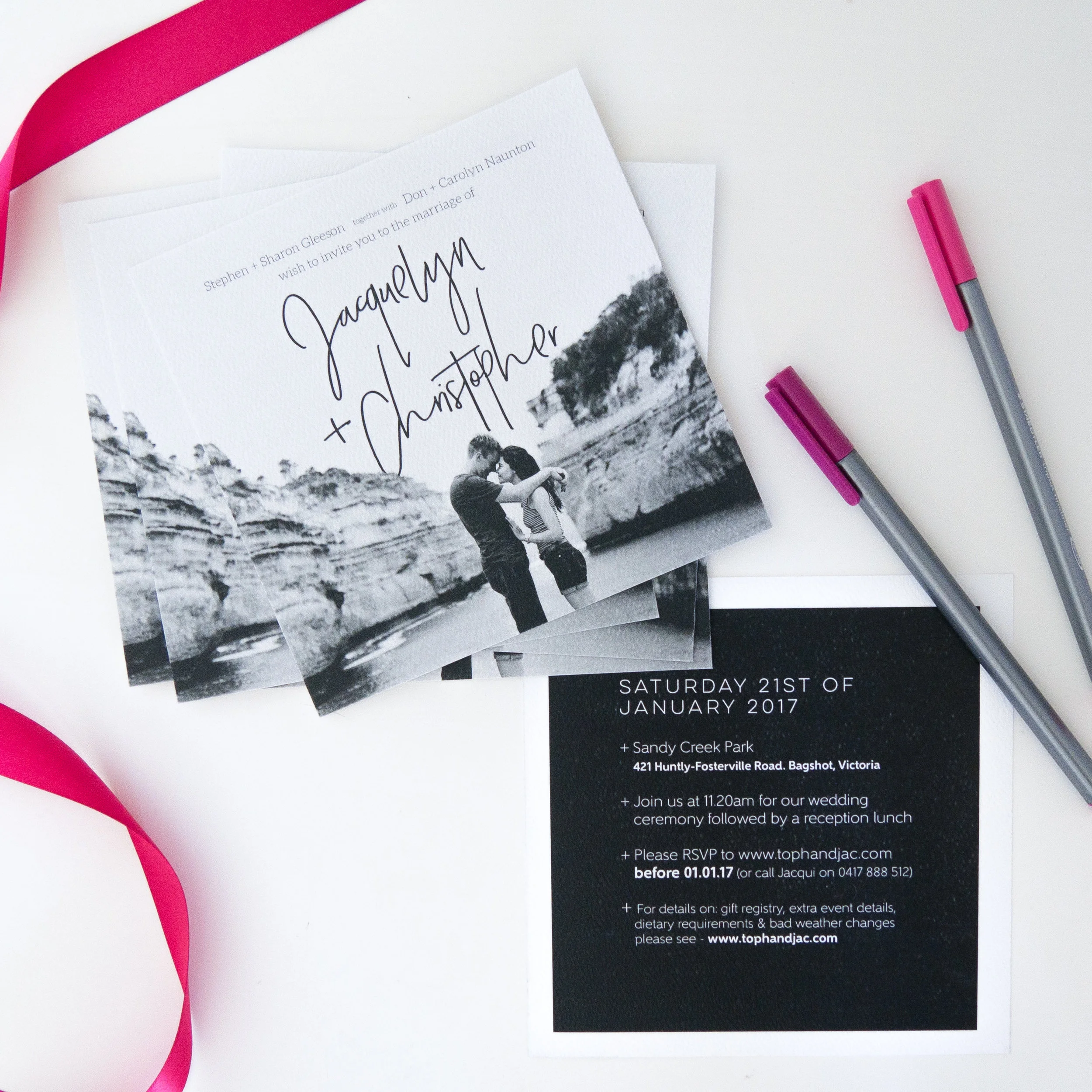 Wedding invitations - featuring personalised tags, perferated RSVP slip and pocket.